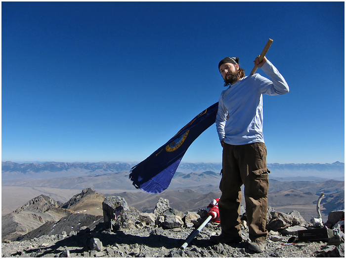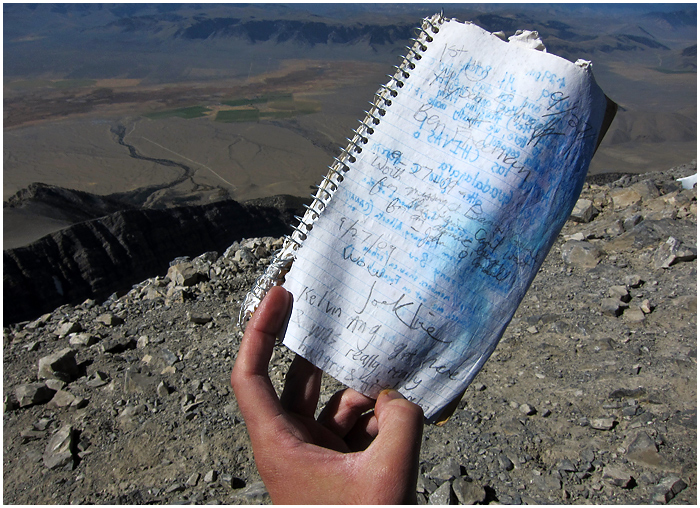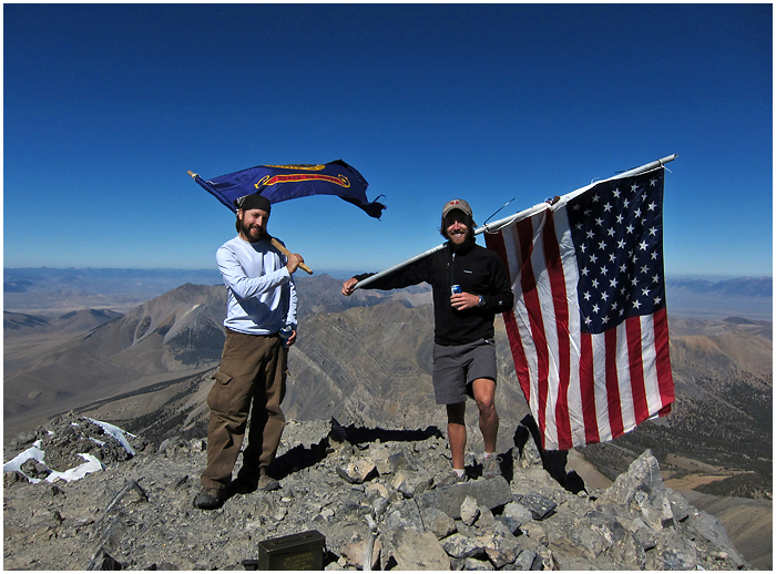 Roughly four hours later, we were rewarded for our efforts with an absolutely clear view from about 12,662 feet. After photos with the flags, finding my old entry in the log book, chatting with a few other climbers, and some time savoring an uncommon vantage point, we made the trip back down. A few hours later, with burning knees and feet, we enjoyed a few cold ones amongst the aspens before hitting the road.