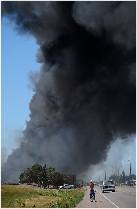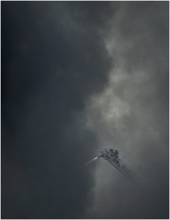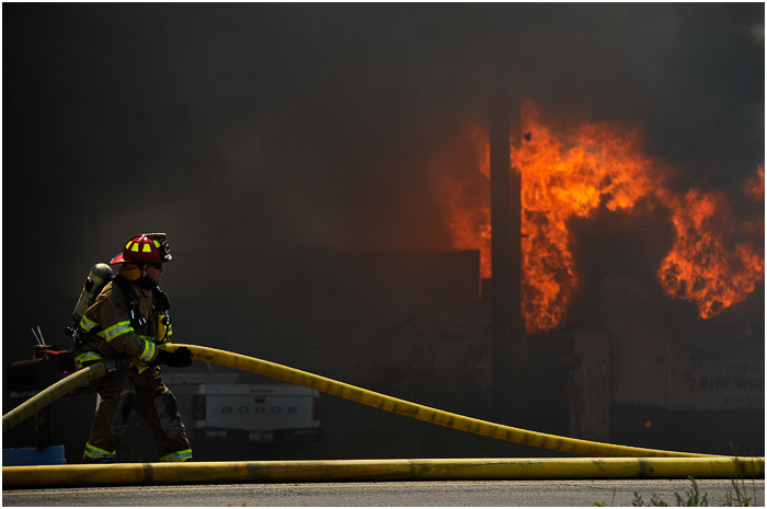 Shortly after arriving at work on Tuesday, I got sent out to cover a massive fire that mostly consumed a local salvage yard. It seems I usually end up going to a lot of false alarms, but with the thick, dark smoke cloud looming in the distance, I knew this was going to be legit. I ran into a number of obstacles trying to get closer but finally got in to where I could see some of the remaining flames. Breathing in this smoke probably didn’t do me any good, and I felt a little ill for a few hours afterwards. Probably not as ill as the owner of the salvage yard, who unfortunately didn’t have insurance.