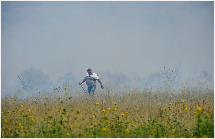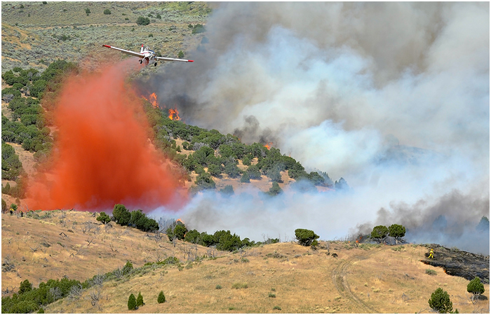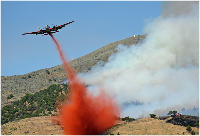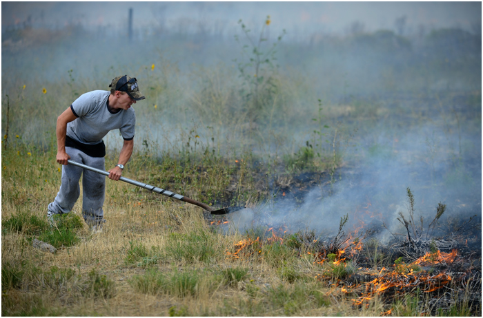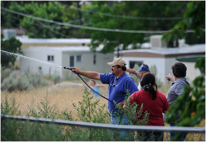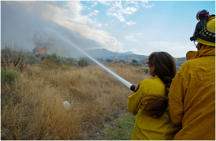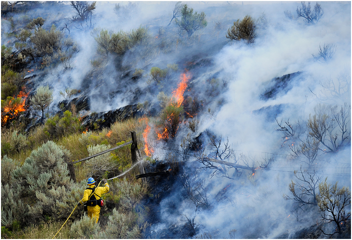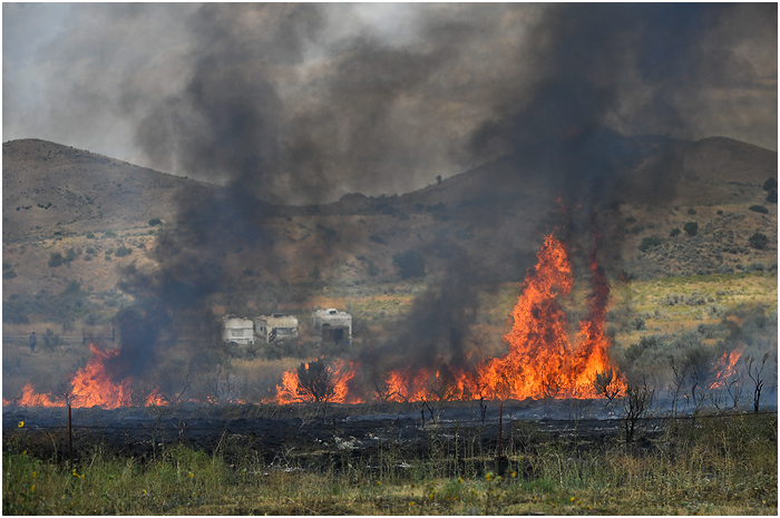 Last week I heard a call over the scanner about a grass fire behind a trailer park in a field formerly the site of a drive-in theater south of town. Lots of times these turn out to be relatively minor and are put out quickly. Not so, in this case. I arrived at the scene soon after the call and spotted a number of residents from the trailer park running around with hoses and shovels trying to keep the blaze away from their homes. Fire crews started attacking the perimeter soon after, and it seemed they would have it under control without too much damage. Unfortunately, the winds picked up and carried the flames into the hills covered in sagebrush and grasses. The fire grew to over a 1,000 acres, and it took crews a few days to finally get under control.