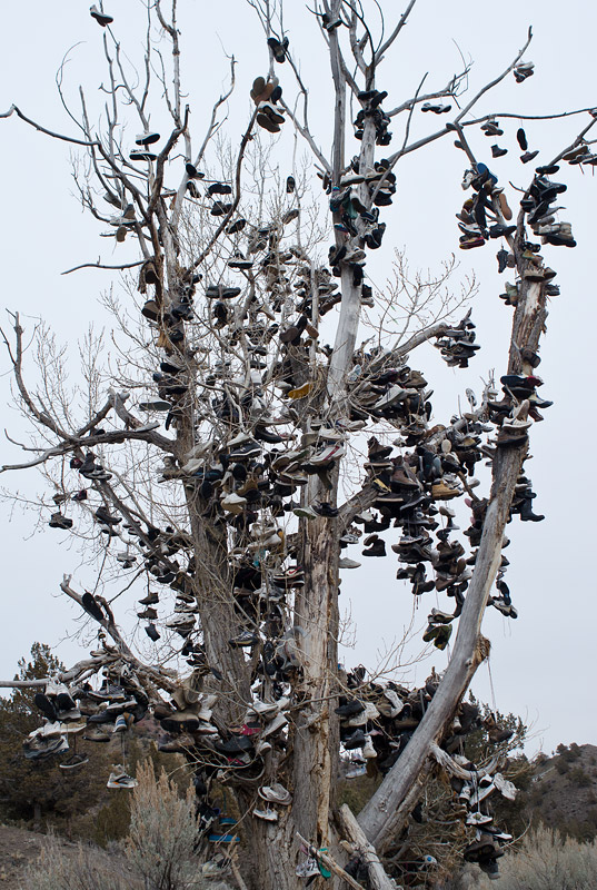 A few weeks back, I got out of town for a day and headed east to check out the colored volcanic ash/rock formations that make up parts of the John Day Fossil Beds. Though the cloudy, overcast day rendered the rocks a little less vibrant, I was struck by the area’s unique landscape. I also couldn’t pass up the shoe-covered tree just off the road along the way. Not sure of its significance but quite a sight.