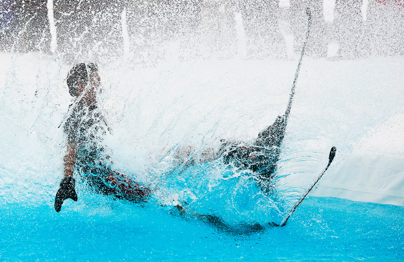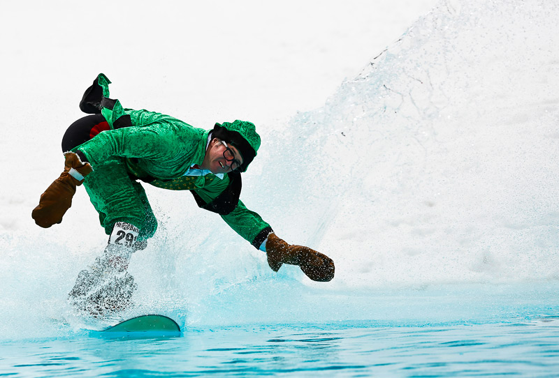 Mt. Bachelor ended the season with their annual Pond Skimming championships on Memorial Day weekend. Contestants ski or snowboard down a stretch of hill and try to clear the icy-cold waters awaiting them at the bottom. With points for style, best wipeout, and costume, this is a fun event to watch and photograph. It was cold enough up there on the sidelines, I can only imagine the feeling of hitting the water and knowing you weren’t going to make it across.